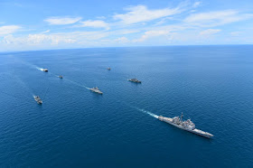 ภาพรูปกระบวนหมู่เรือผสมกองทัพเรือไทยและกองทัพเรือสหรัฐฯระหว่างการฝึกผสม CARAT 2019 Thailand ระหว่างวันที่ ๒๘ พฤษภาคม ถึง ๘ มิถุนายน พ.ศ.๒๕๖๒(2019) ที่ผ่านมานั้น