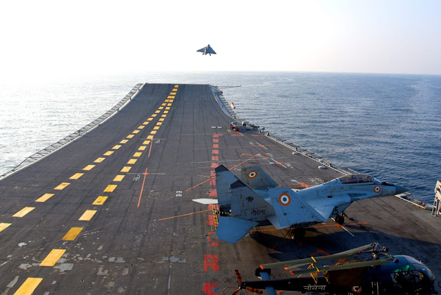 First landing of Naval version of the Indian-made Tejas Mk1 Light Combat Aircraft on Indian Navy aircraft carrier INS Vikramaditya, January 11, 2019. (Picture source Twiter account DRDO)